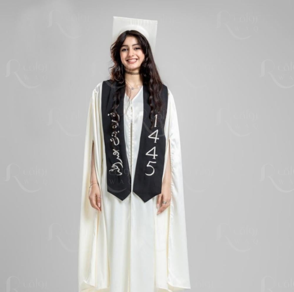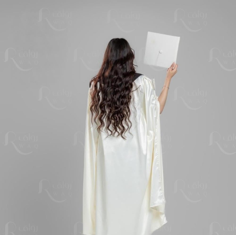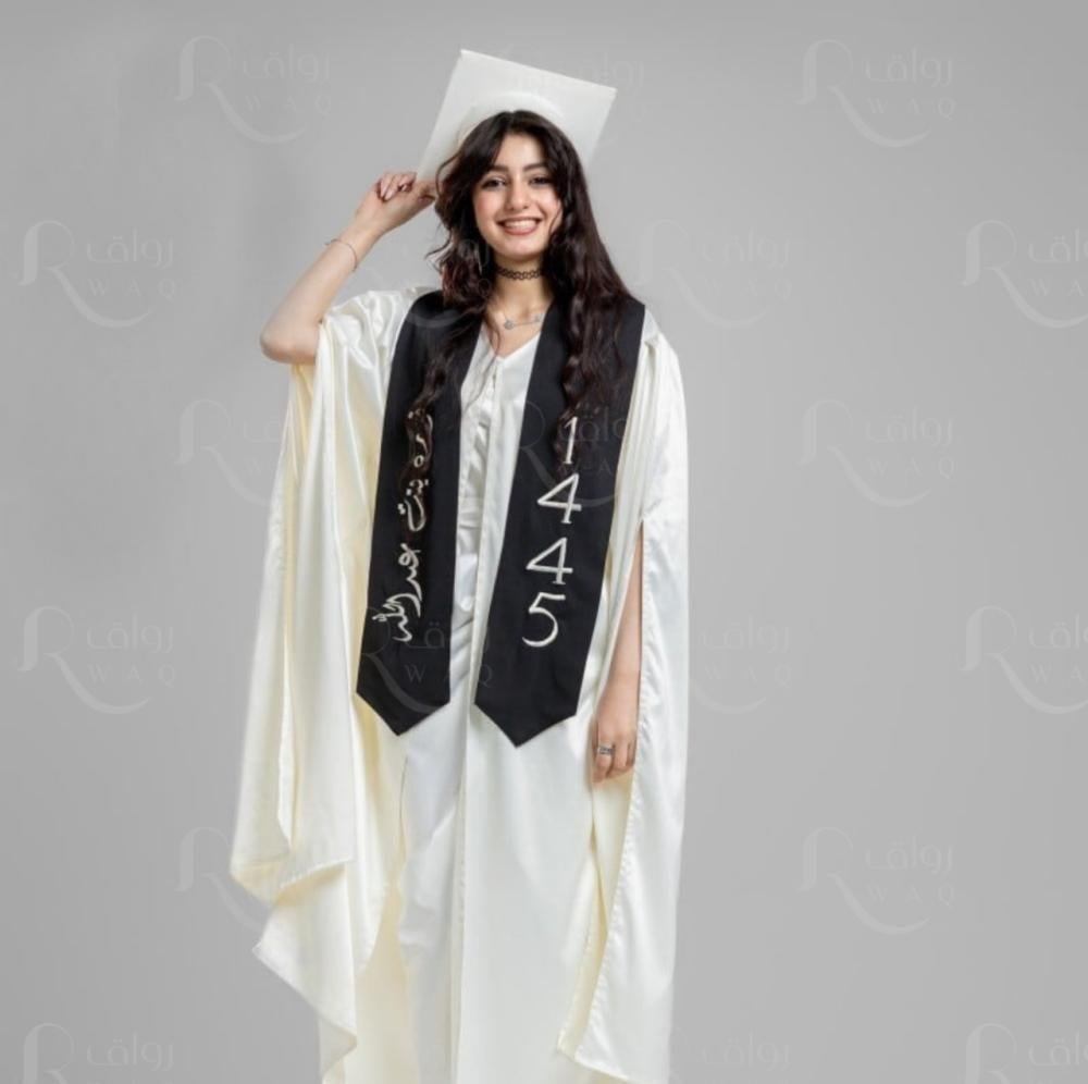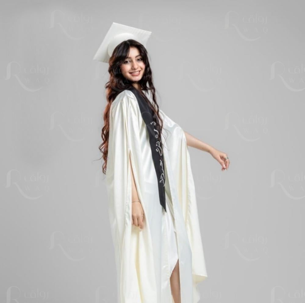 عباية تخرج باللون الابيض بقماش تفته بكم عريض مزين بقيطان باللون الكحلي ومشبك اغلاق